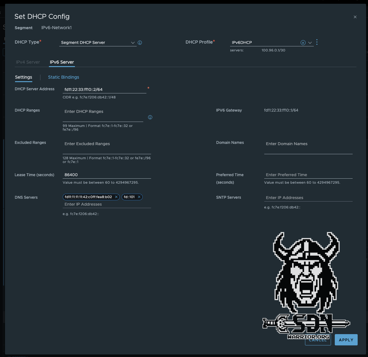 Then I create an overlay segment connected to my IPv6 T1 and configure the following IPv6 gateway CIDR: fd11:22:33:ff10::1/64. I also create a segment DHCP server in which I specify the ULA IPs of my DNS servers in the lab and, of course, a DHCP server IP address from the segment. In my case, I simply take the next free IP fd11:22:33:ff10::2/64.
