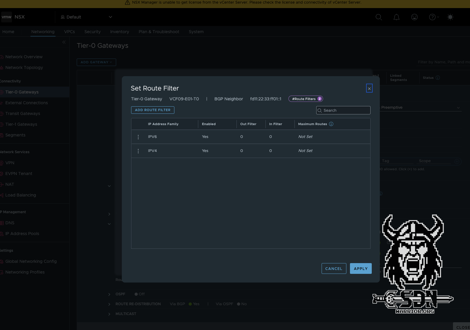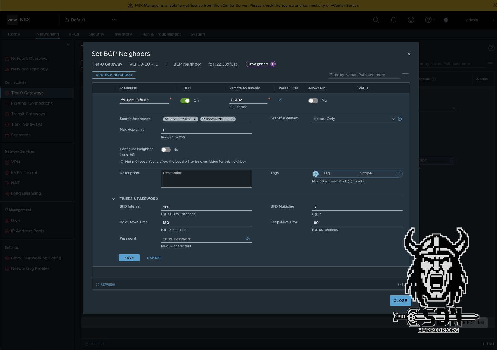 Next, the routing must be created on the T0 router. It is important to note that an IPv6 session must be created and an IPv6 route filter must be added to the default IPv4 route filter. Otherwise, the routing will not work. The rest of the configuration is standard. I always use BFD in my setups for fast network convergence, but it is not a must.