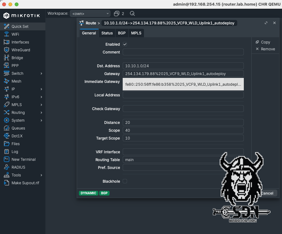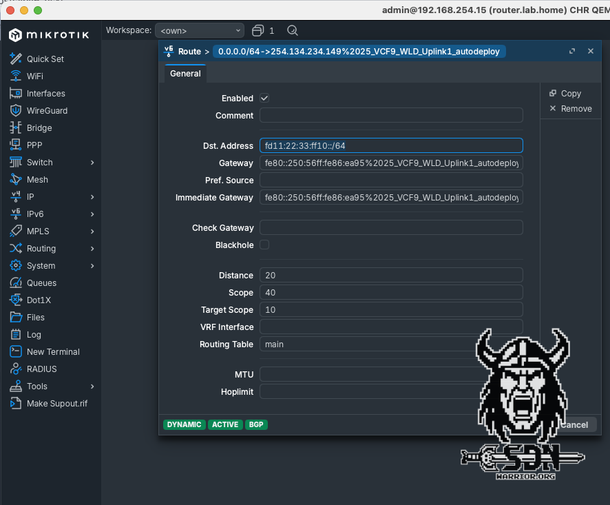 BGP peering should now be up and running. The IPv4 routing table on the Mikrotik looks a little strange. The immediate gateway shows the link local IP address of the NSX Edge Node. The IPv4 address is only how RouteOS represents IPv4 over IPv6 and is not actually used.