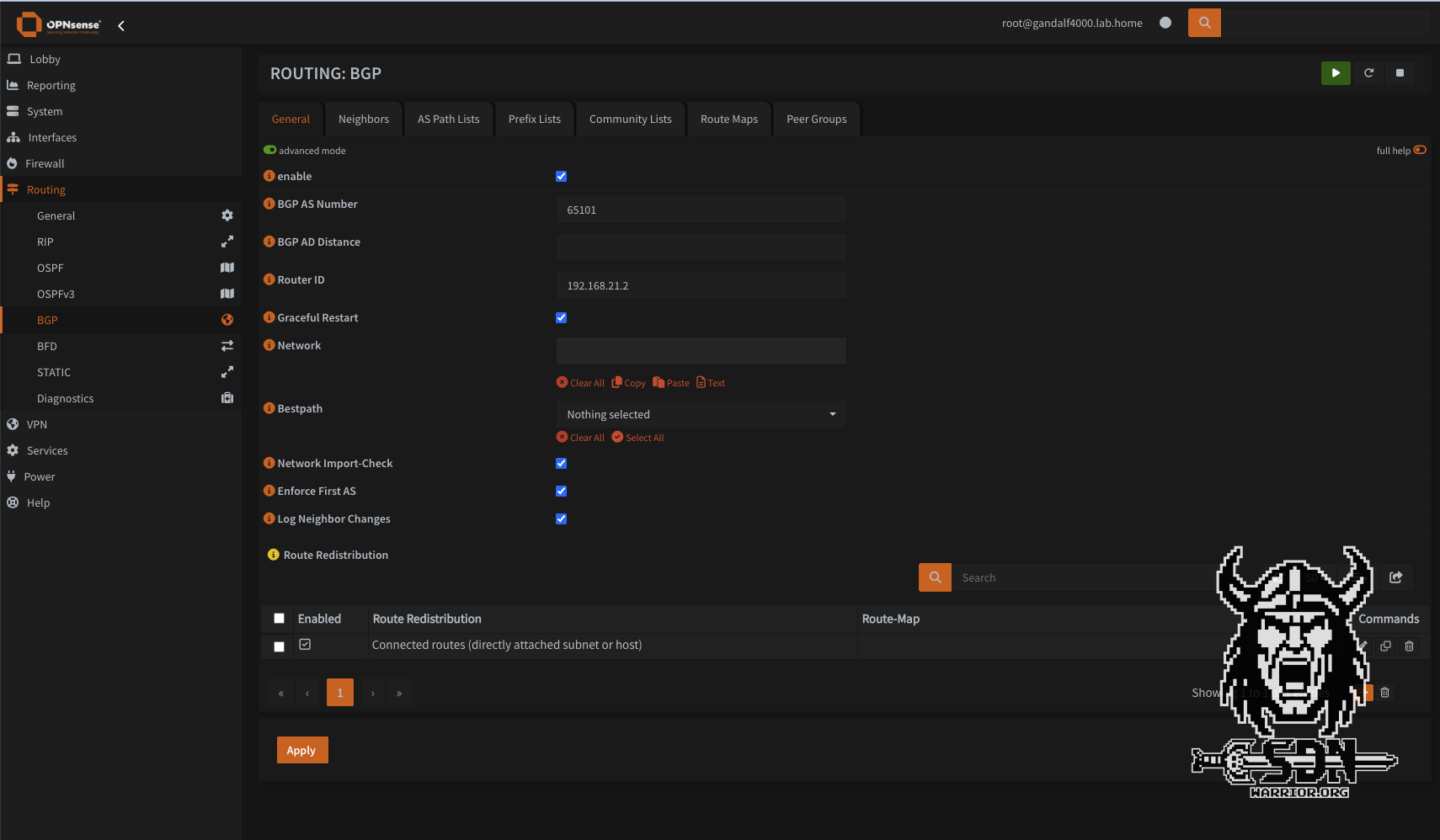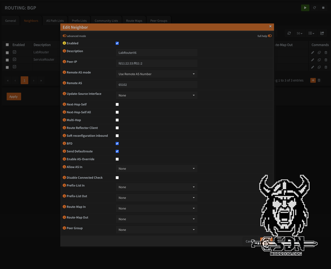 But let’s get to the first problem I had. My lab already had a BGP configuration between the lab router and OPNSense via IPv4. OPNSense Business Edition does not properly support IPv6 route exchange via IPv4.