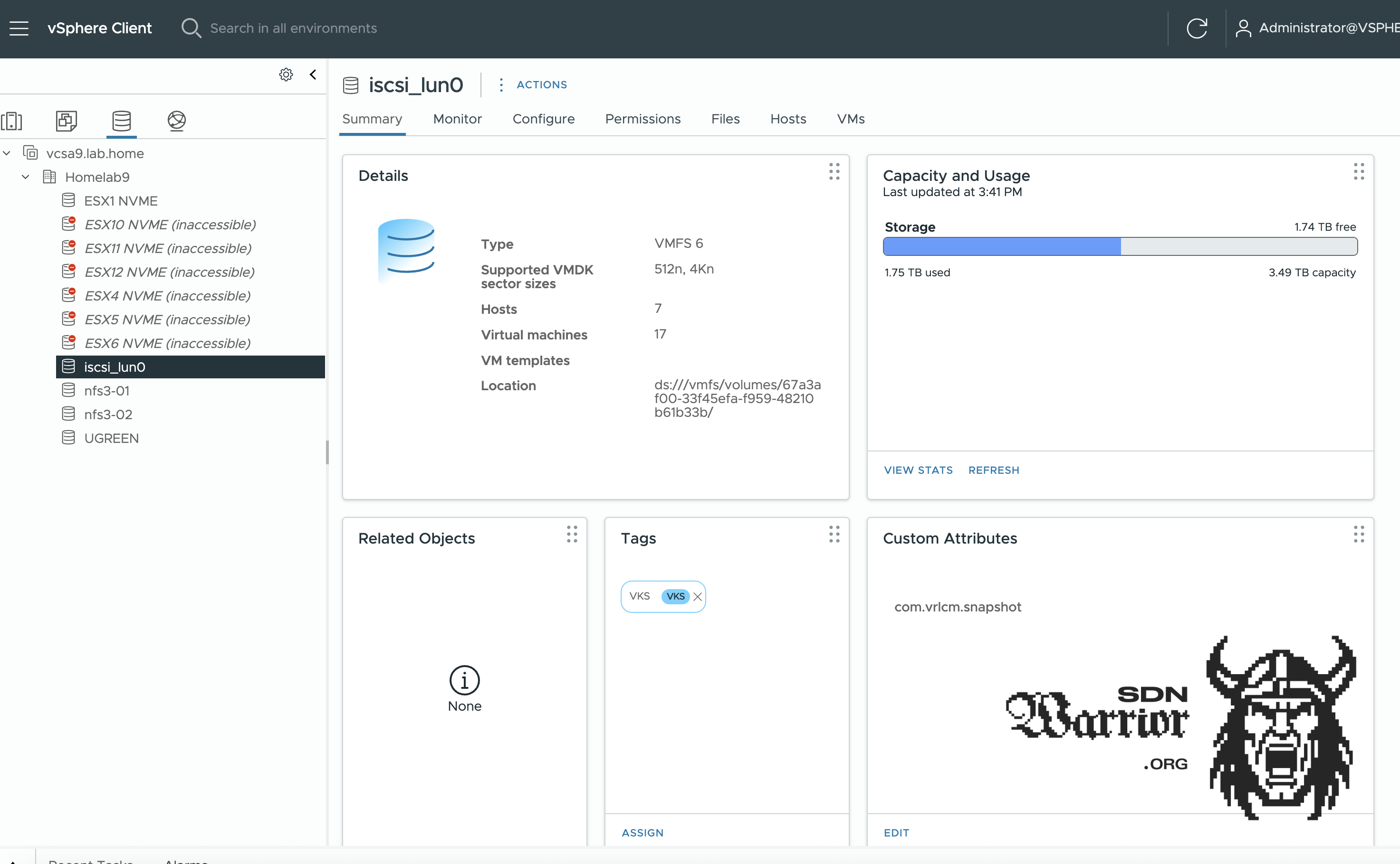 Now you might ask yourself why I did it this way. Well, iSCSI has the advantage that I can implement a multi-path fabric and is basically my fastest storage, since I have 2x 10 Gb/s iSCSI and can utilize it to its full capacity. All my servers are equipped with 2x10 Gb/s networks (except for my small management NUC). My iSCSI storage runs VMs that require maximum storage performance. I use NFS for VCF nested labs where I don’t want to use vSAN, and most of the time I don’t want to use vSAN in my lab for resource reasons. Fortunately, this is now supported without any problems with VCF9. But why did I build two NFS shares and not just one large share?